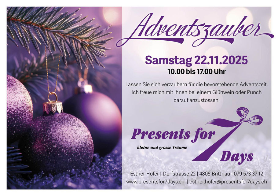 By Presents for 7 days findet der Adventszauber am 22.11.2025 statt. Ich freue mich über Ihren Besuch...